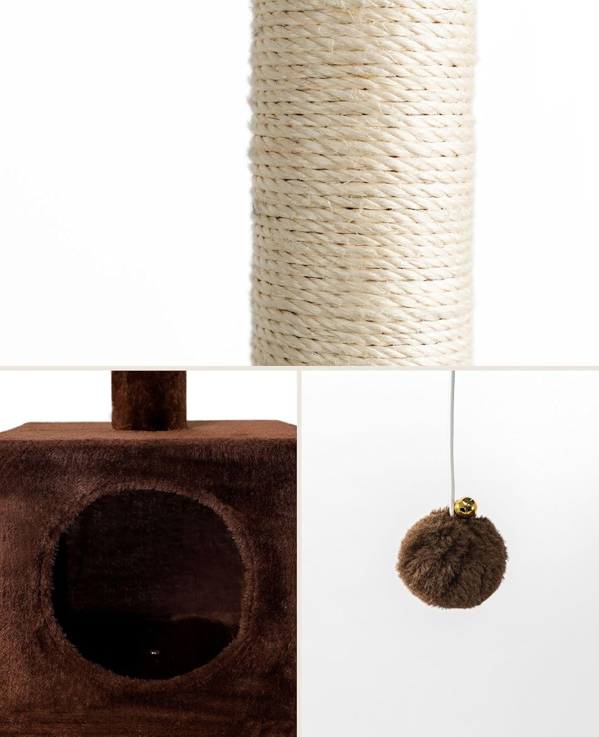 Torre de escalada para gatos cómoda y respetuosa con el entorno: la torre de escalada está envuelta con una cuerda de sisal natural, que es conveniente para que los gatos muevan sus garras y se diviertan, protegiendo los muebles del daño; La tela de felpa de alta calidad cubre la superficie, es cómoda y agradable para la piel, proporcionando una experiencia suave y confortable para los gatos.