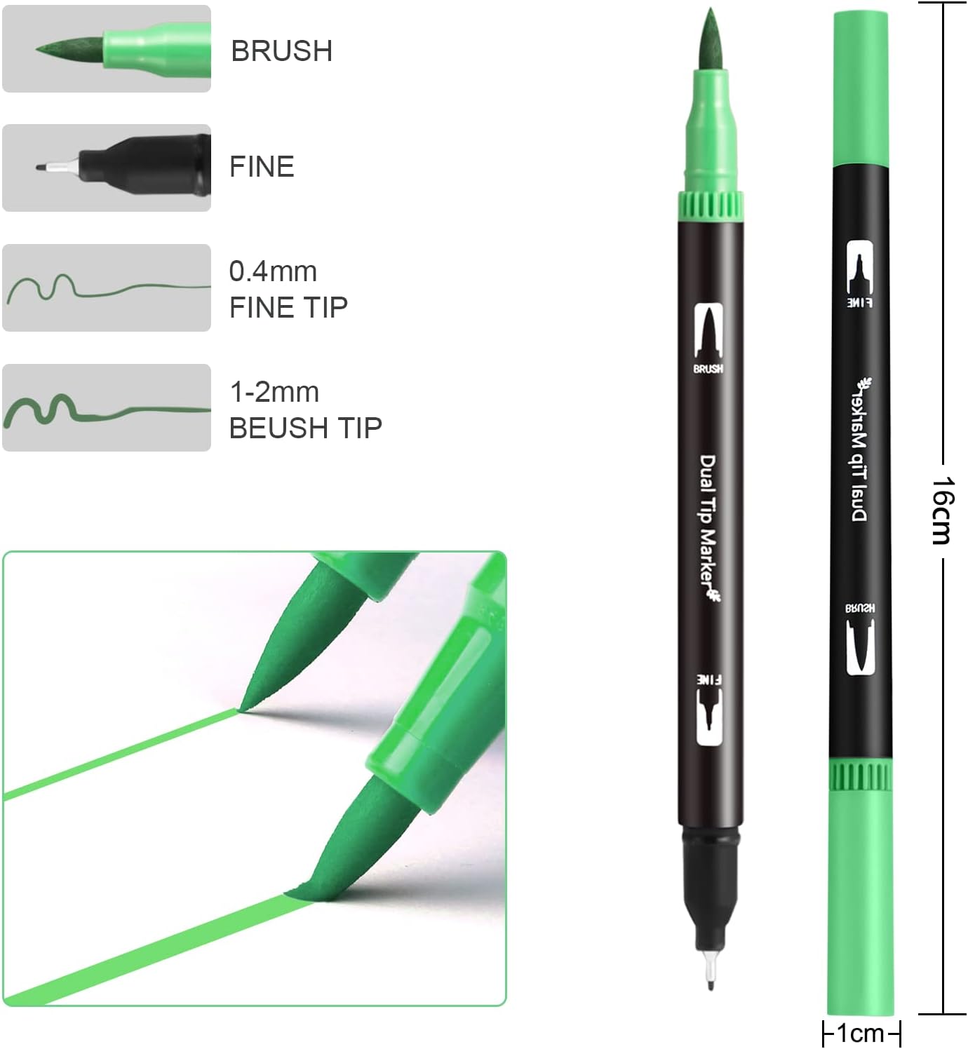 Cada marcador ofrece dos opciones de punta: una punta tipo pincel de 1-2mm ideal para sombrear y colorear amplias áreas, y una punta fina de 0.4mm perfecta para detalles precisos y contornos definidos. Esta versatilidad los hace adecuados para una variedad de aplicaciones, desde dibujar y escribir hasta colorear y realizar lettering.